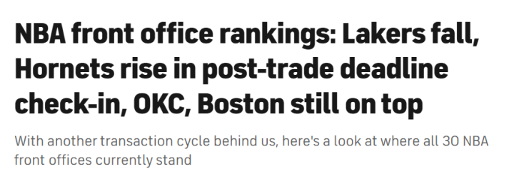 北京时刻2月18日,驰名好意思媒CBS对定约30队的贬责层进行了名次,其中雷霆贬责层居首,凯尔特东说念主第2,火箭第3,骑士第5,豪杰第17,湖东说念主第25,国王垫底。具体名次如下: