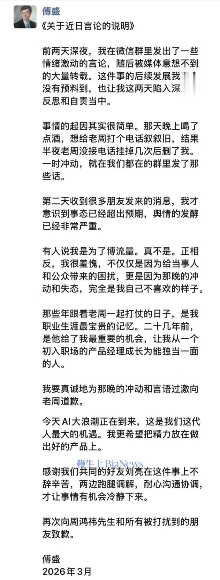 当天凌晨,剧情平直迎来回转,傅盛在一又友圈发长文向周鸿祎说念歉。