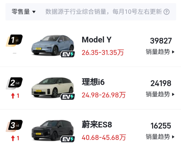 我查了下3月份,30万以上纯电SUV的销量排名榜,前三车型差别是Model Y、理思i6、蔚来ES8,固然蔚来ES8的销量仅排第三。