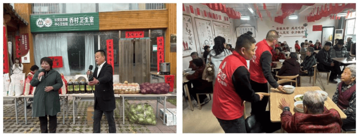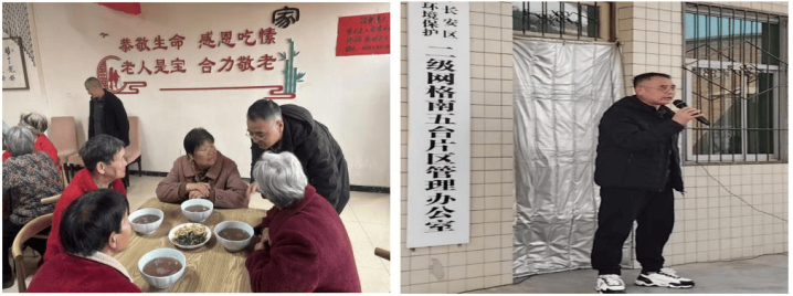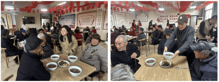 7、民建会员在老年幸福院为老东谈主端饭送餐与老东谈主互动场景。